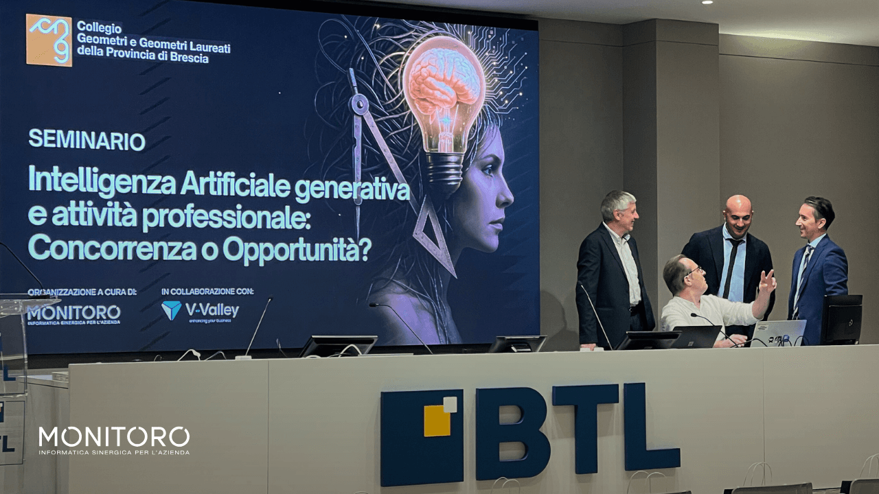 Il 19 settembre 2025, presso l’Auditorium BTL – Banca del Territorio Lombardo di Brescia, si è svolto il primo seminario organizzato da Monitoro, in collaborazione con V-Valley, per il Collegio Geometri e Geometri Laureati della Provincia di Brescia. Un evento che ha richiamato circa 400 Geometri iscritti all’Albo, confermandosi come un’occasione unica di confronto sull’adozione e l’impatto dell’IA generativa nelle professioni tecniche. .